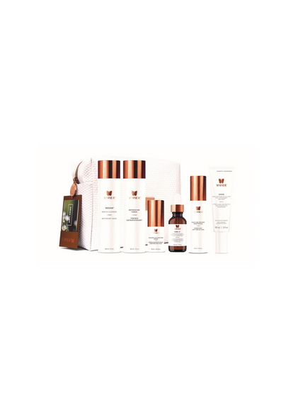 Votre programme anti-âge personnalisé inclut six produits en format régulier de catégorie pharmaceutique dans un élégant sac à cosmétique.