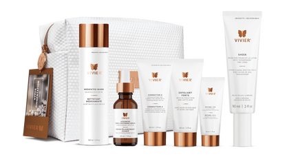 Votre programme Hyperpigmentation (2% d'Hydroquinone) inclut six produits en format régulier de catégorie pharmaceutique dans un élégant sac à cosmétique: